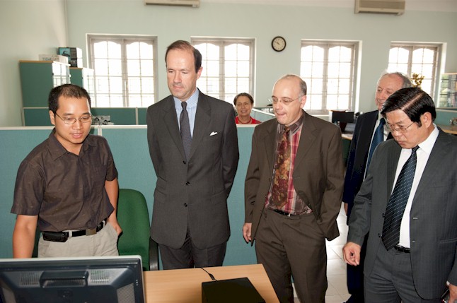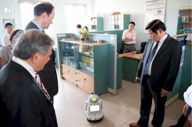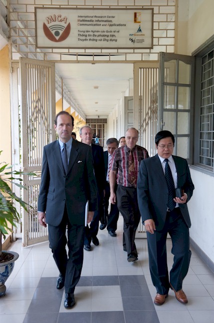 ...dans la salle de réception pendant une quinzaine de minutes. Puis, après cet accueil des plus chaleureux, M. L'Ambassadeur a été invité a rencontrer une bonne trentaine de cadres francophones de l'IP de Hanoi (HUST), tous doyens ou vice-doyens ou directeurs de départements ou de programmes. Après un transfert rapide vers le bâtiment C10, S.E. l'Ambassadeur a été invité à visiter le Centre MICA. Plusieurs démonstrations lui ont été présentées dans les domaines des technologies vocales, des interactions homme-robot et des environnements perceptifs. |