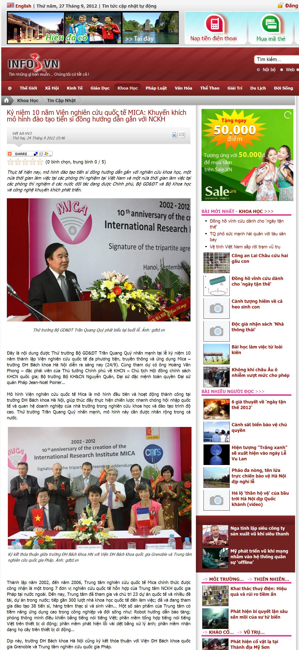 Article dans le journal Info.vn du 24 septembre 2012. (article en vietnamien)